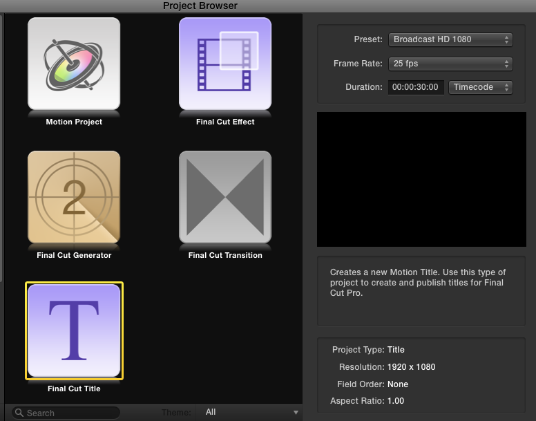 2) Ställ in de inställningar (Preset, Frame Rate, Duration kan du välja 30sek.) som vanligtvis använder (detta är inte så viktigt, det fungerar ändå). Klicka på ”Final Cut Title” (detta val är viktigt om det ska fungera).