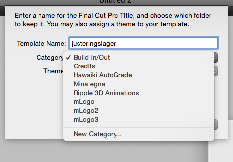 6) Döp effekten (Template Name) till Justeringslager eller om du vill till Adjustment Layer. Jag föreslår att du skapar en ny Category (New Category) och döper den till t ex ”Mina egna”.